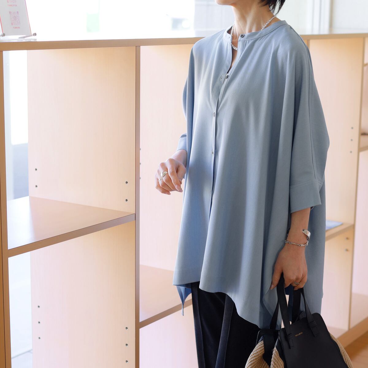 ゆったりスクエアシルエットのバンドカラー&6分袖ボディーに