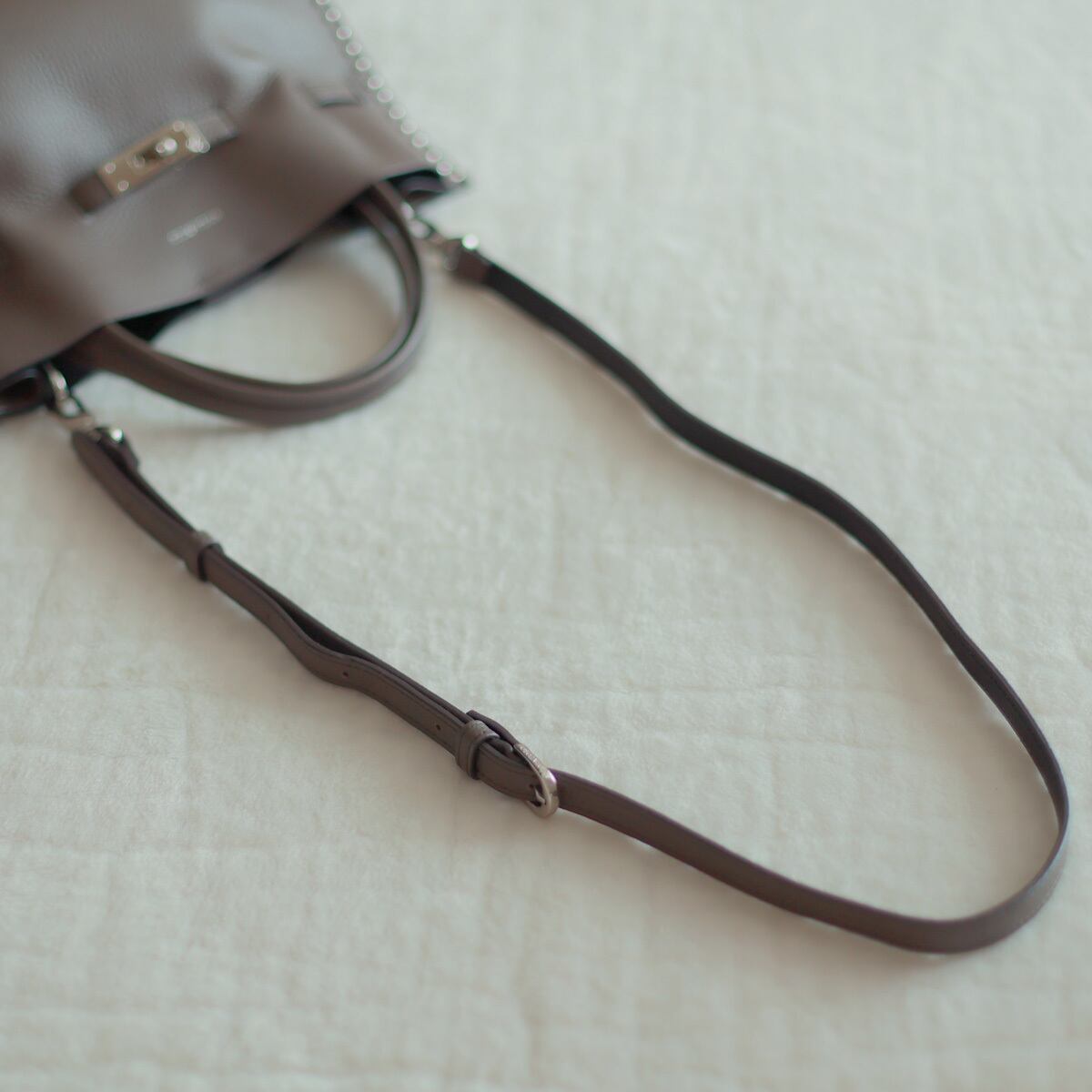 共素材のベルトとメタルロックで柔らかなドレープをプラス。