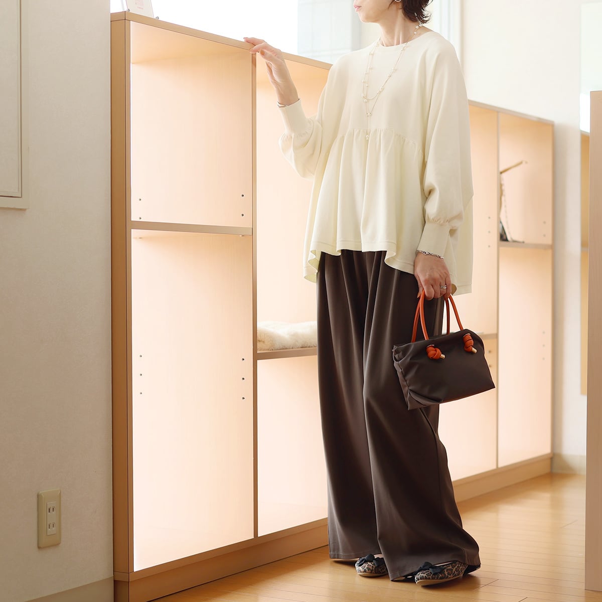 しっかり裾幅を取ったワイドシルエットとの組み合わせで、