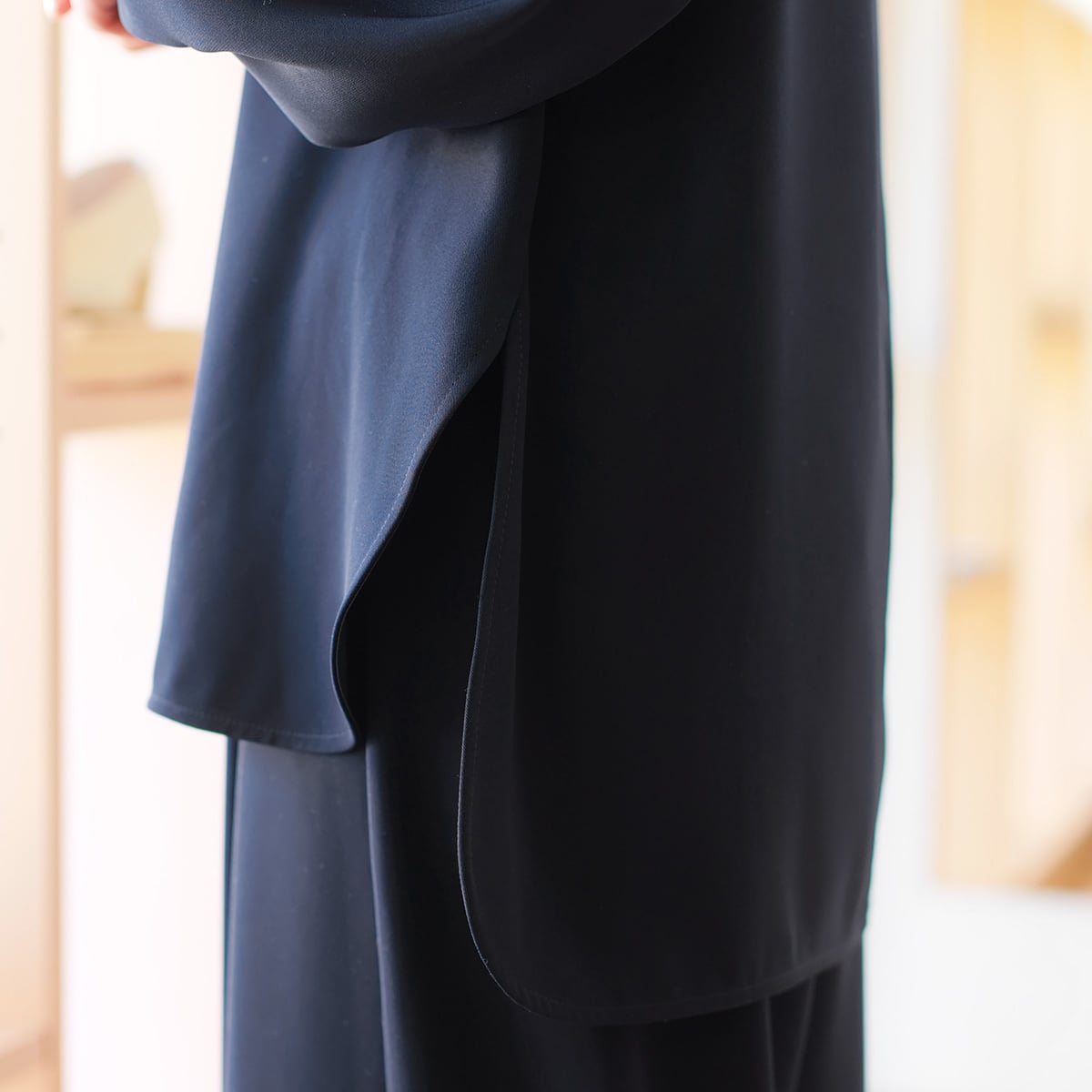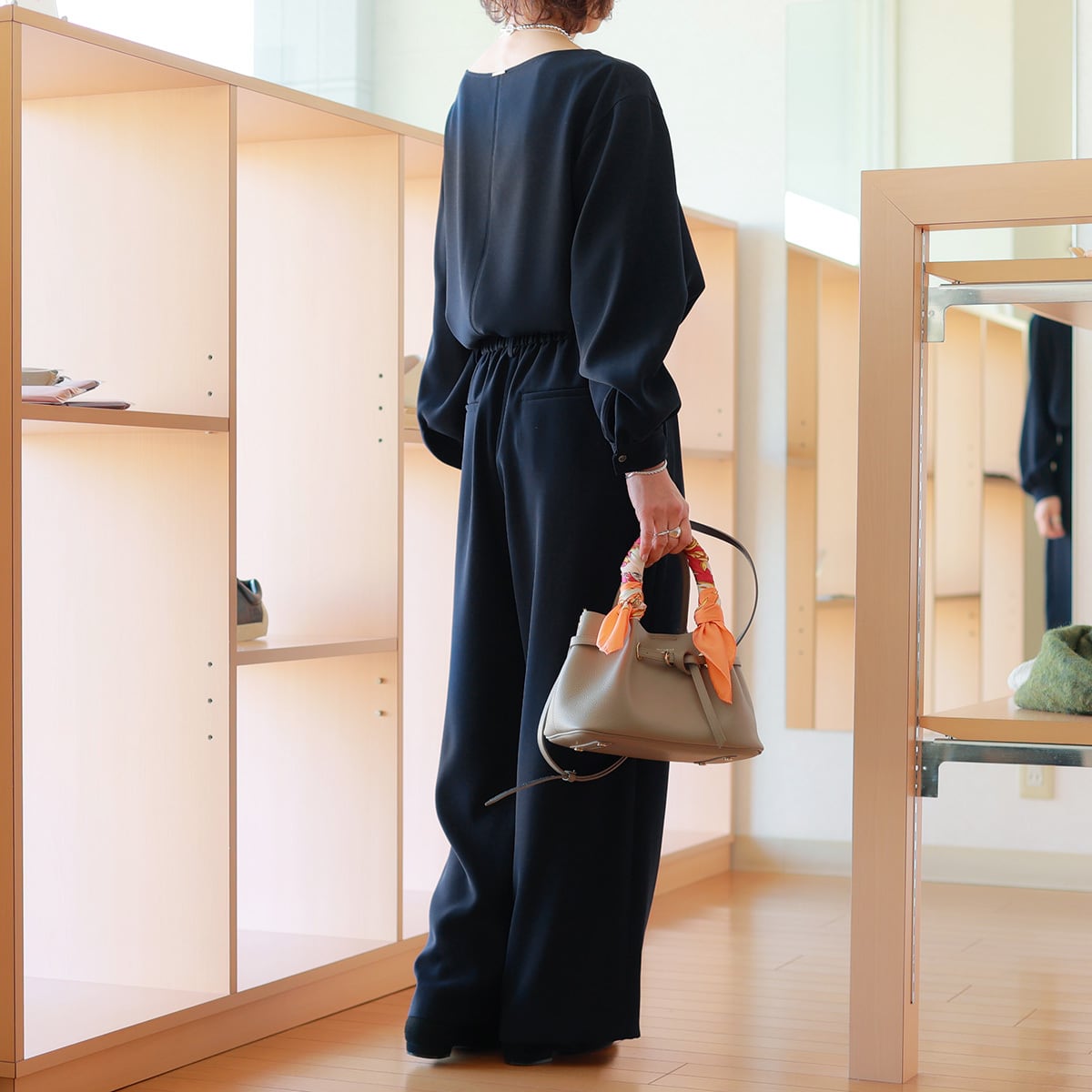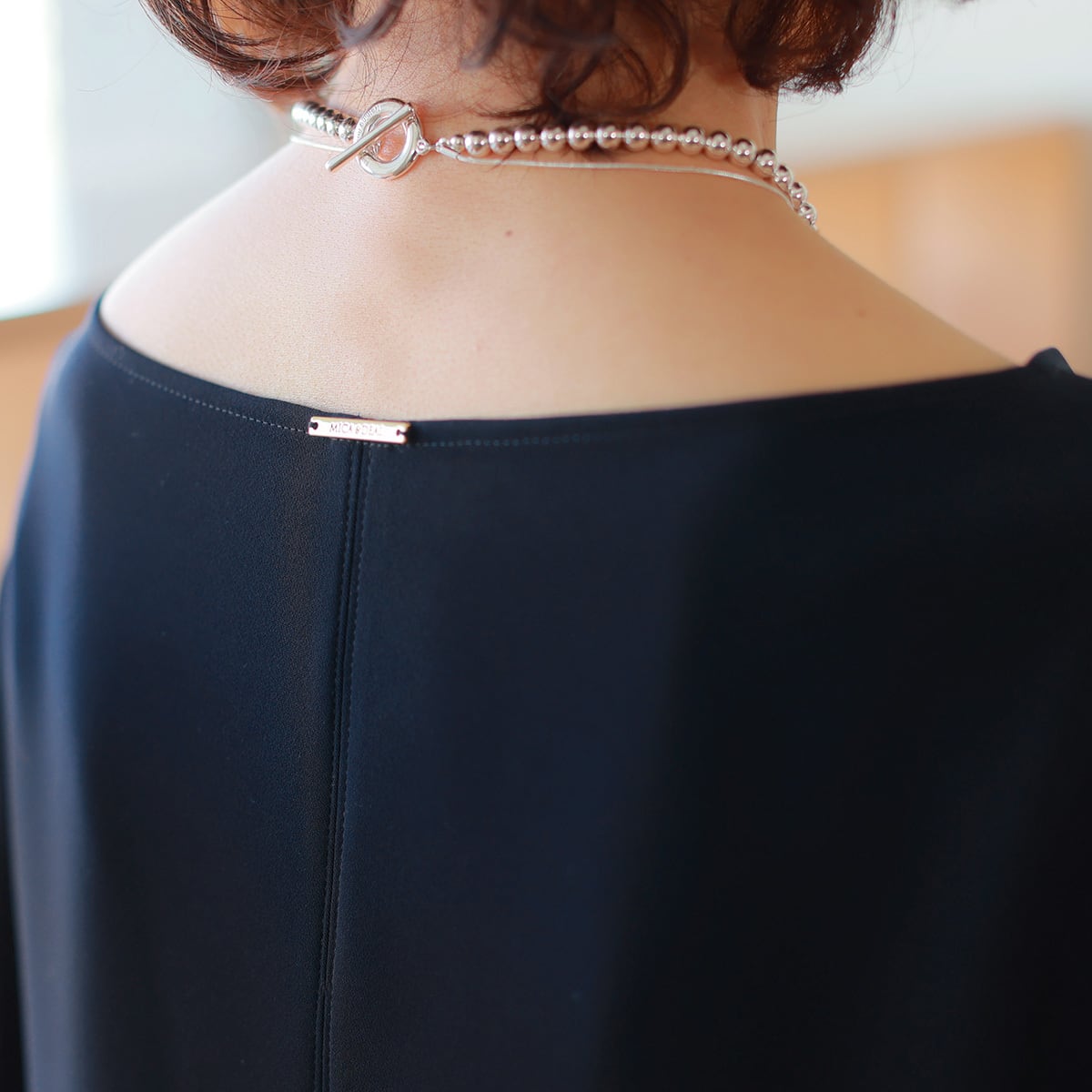 動きに合わせ生まれるドレープも柔らかでしなやかな表情見せる