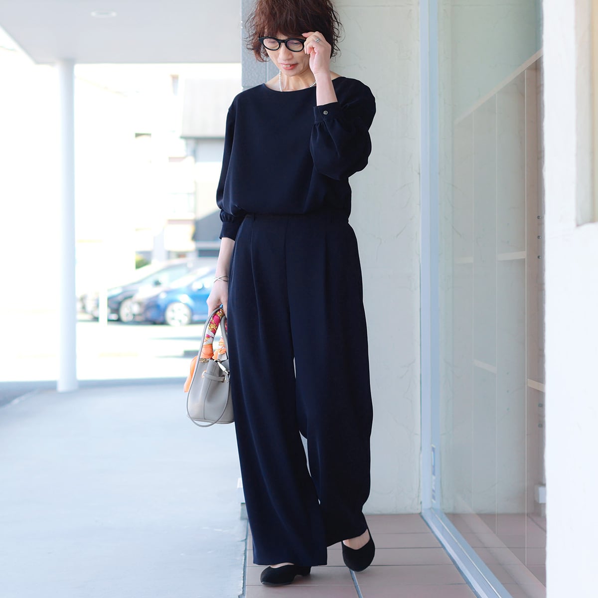 落ち感素材で仕立てたブラウスは