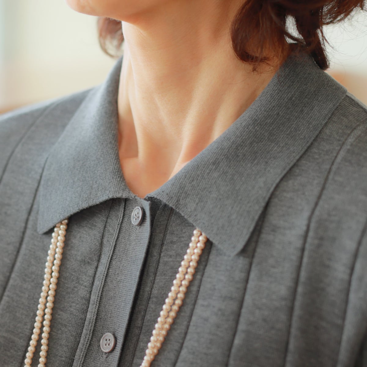 前下がりを下げたポロ衿デザインとフルボタンフロントに