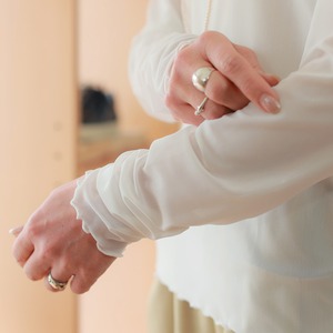 クシュっと袖口にドレープ溜まるスリーブと