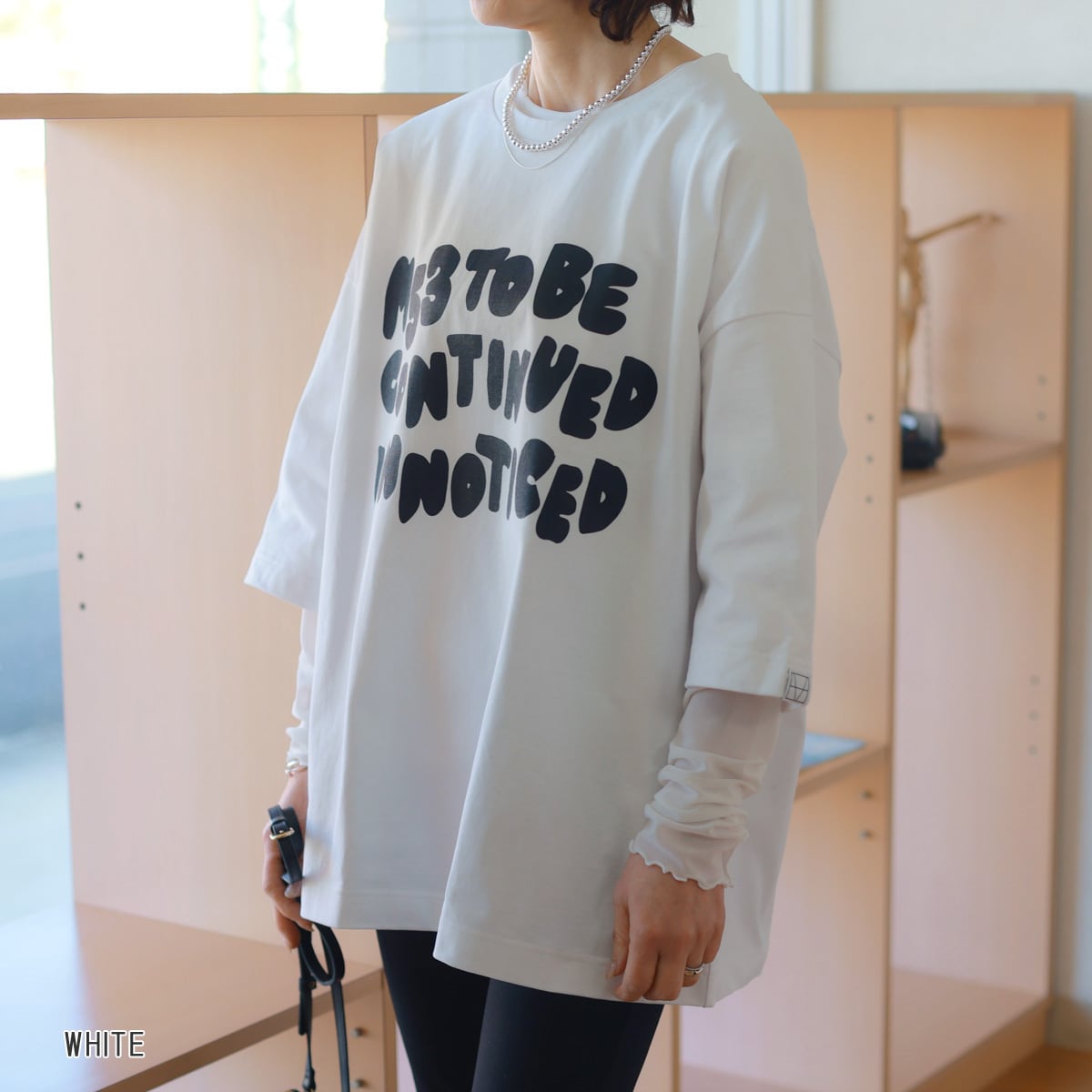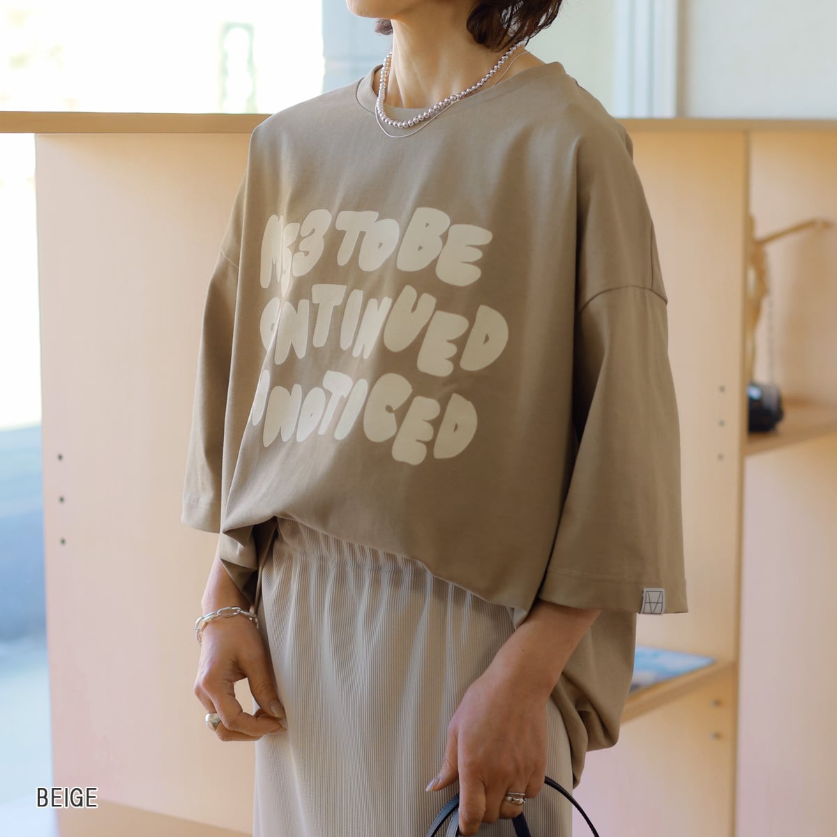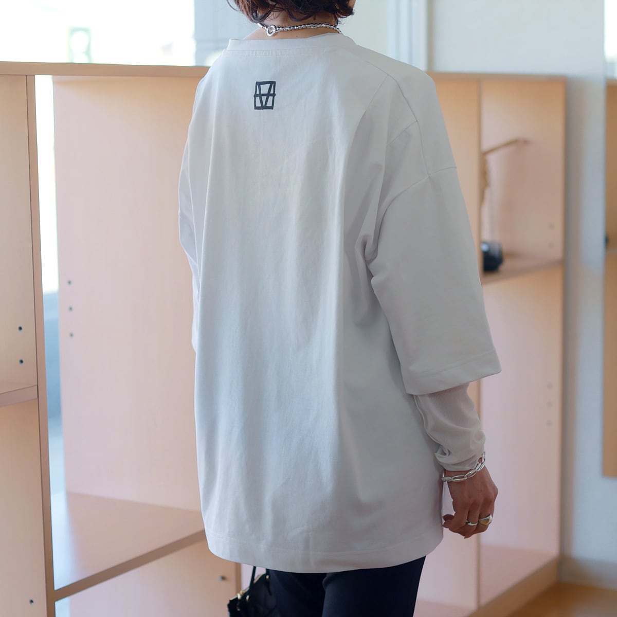 肘越え丈のワイドスリーブと肩のタックがポイントです。