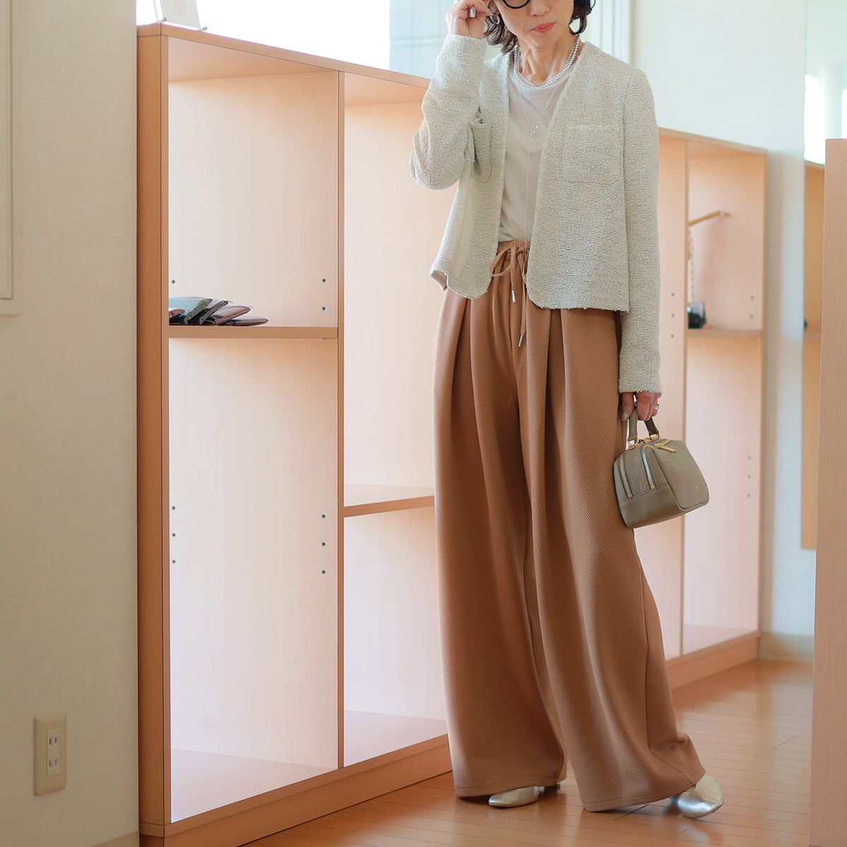 落ち感柔らかなワイドパンツから