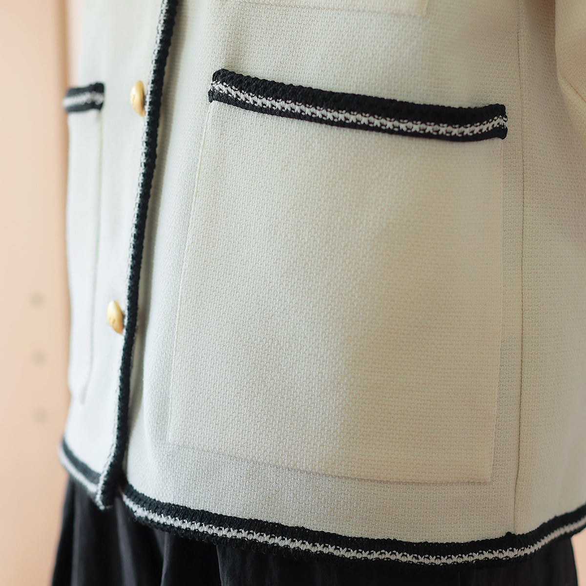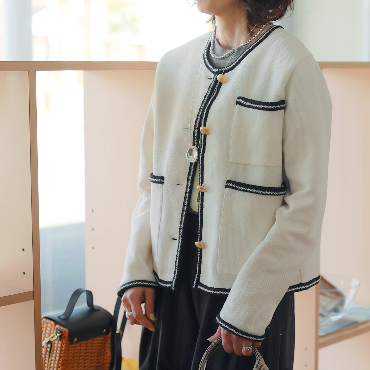 オリジナルインレイ編み素材で仕立てたジャケット。