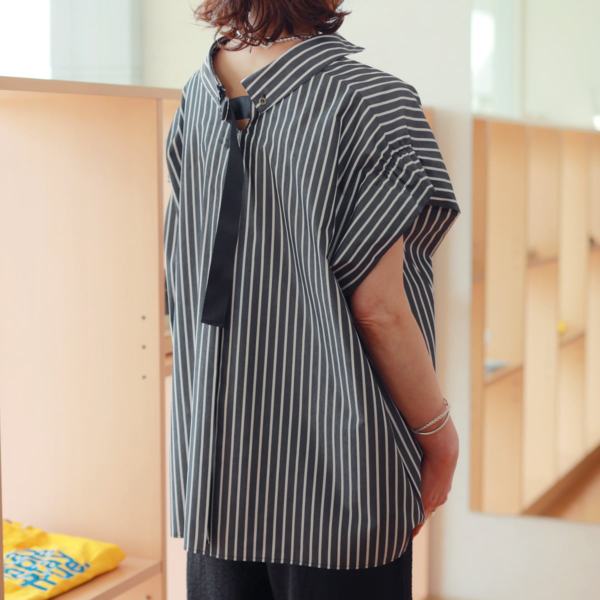ギャザー寄せたフレンチスリーブと低く抜いたシャツカラー、