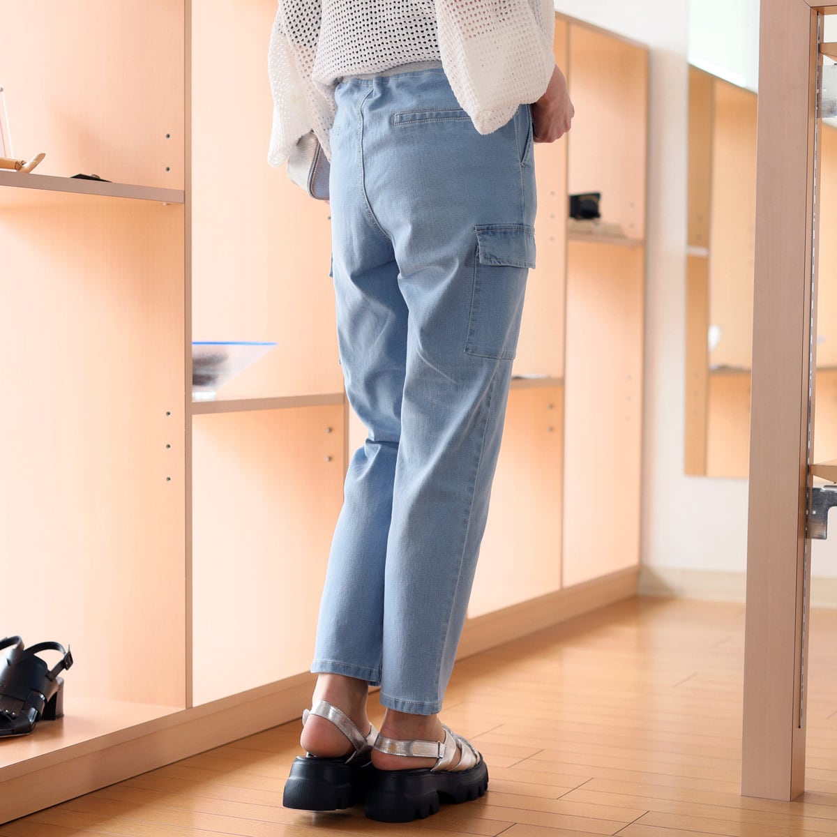 Priority (プライオリティ) ストレッチデニム リラックステーパード リブウエストカーゴパンツ